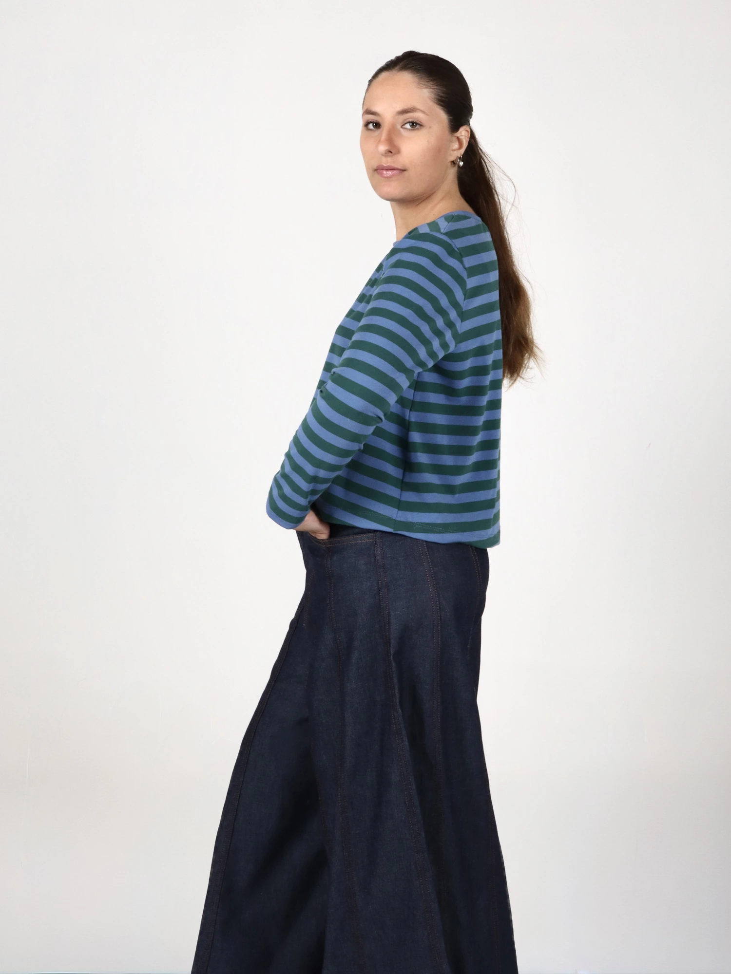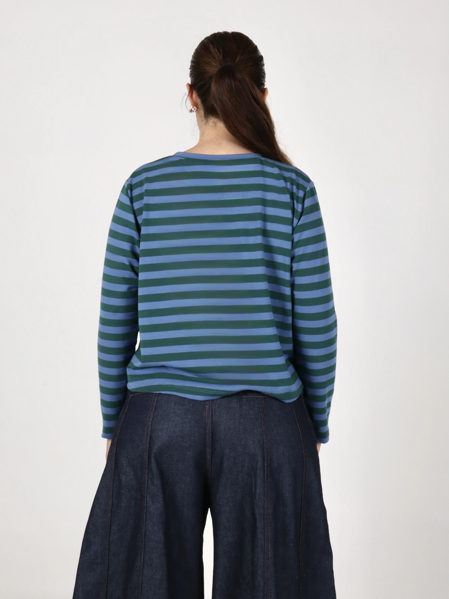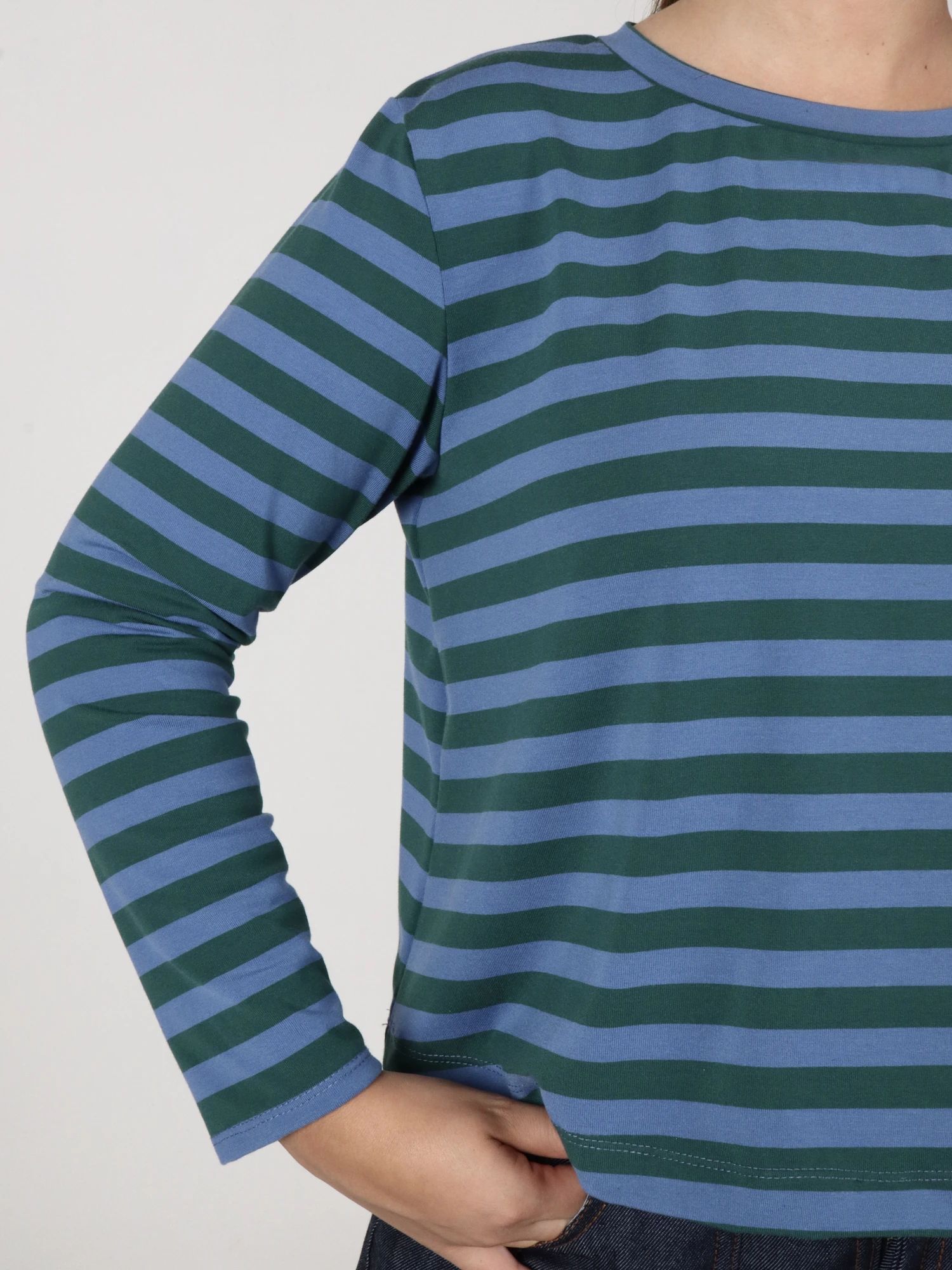 Remera confeccionada en un tejido de 85% poliéster, 11% rayón y 4% elastano, seleccionado por su suavidad, elasticidad y excelente recuperación. La tela se destaca por su color vibrante y definición de rayas, que conservan su intensidad y estructura con el uso.
